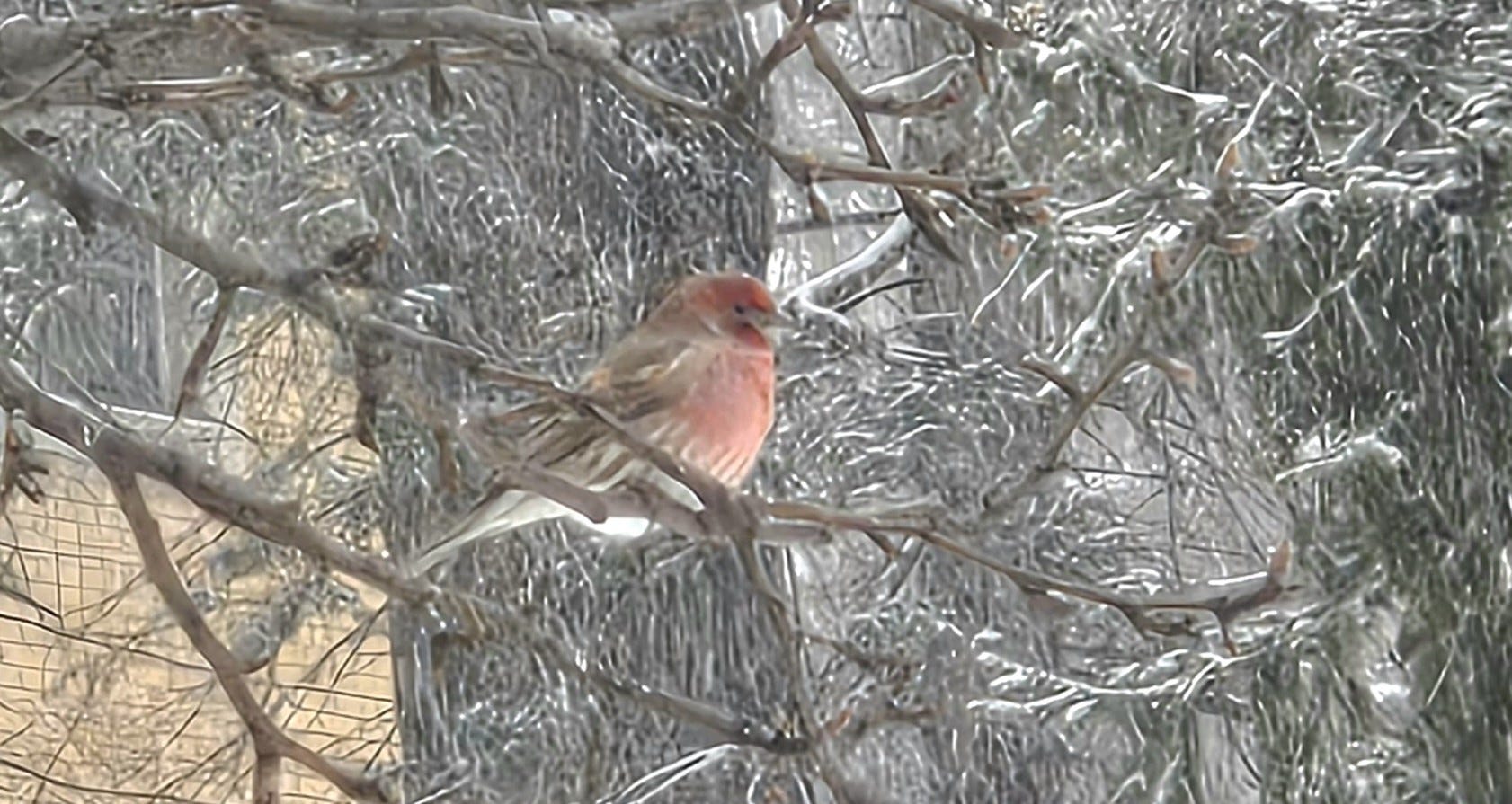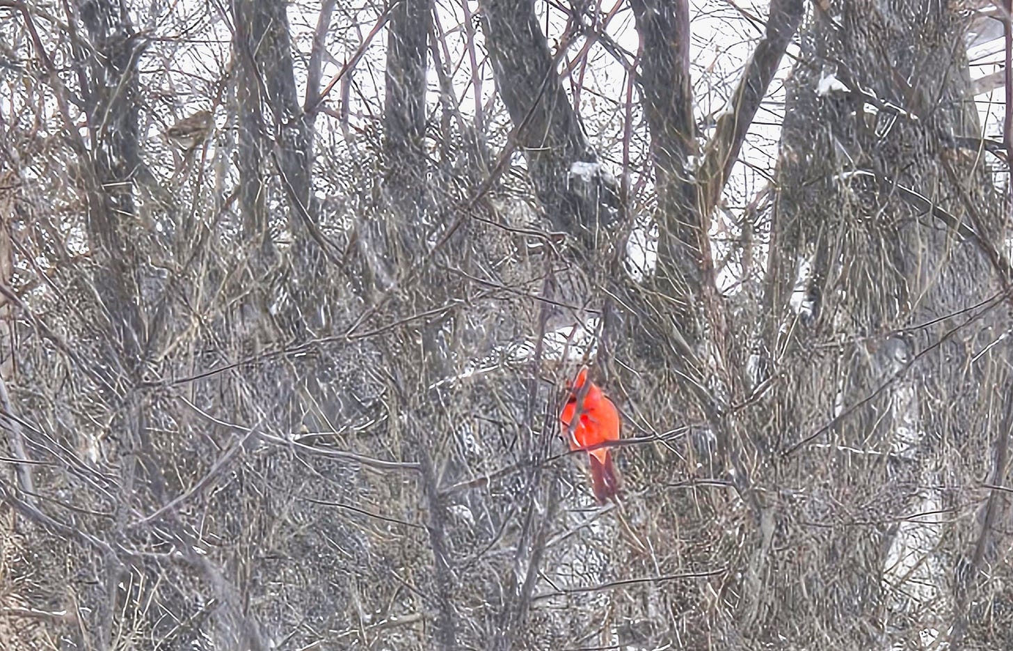 My husband is with his dying sister in sunny Florida. I ache with sadness that I cannot be with her, too. But then I spot one of nature’s gems—-a male Northern Cardinal in a bare tree. A real-life snow globe scene. (Extra points if you can also spot the American Goldfinch.)